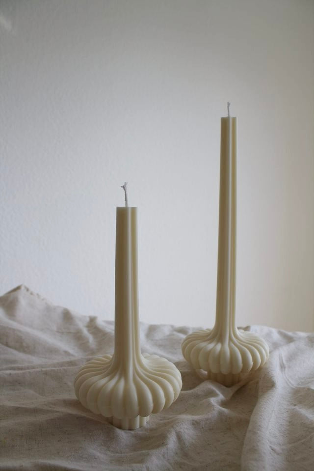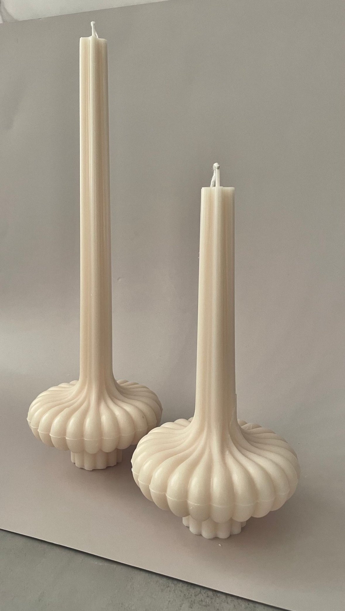 Die Ajon-Kerze vereint skulpturale Eleganz mit natürlicher Sanftheit. Ihre geschwungene, bauchige Basis geht in eine fein zulaufende Spitze über – eine Form, die an organische Schönheit erinnert und zugleich modern wirkt.